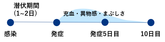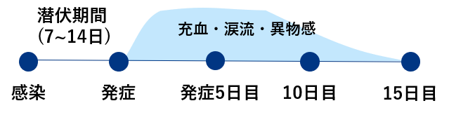 症状としては、目がゴロゴロする、眩しい、充血、結膜にブツブツが出るなどです。